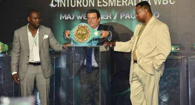 "Se usaron 3.017 esmeraldas en la preparación del cinturón, tiene un contenido de plata, un contenido de oro, la piel es de la marca Ferrari y las monedas son de oro con los rostros de Pacquiao, Mayweather, Muhammad Alí y de José Sulaimán”, agregó.