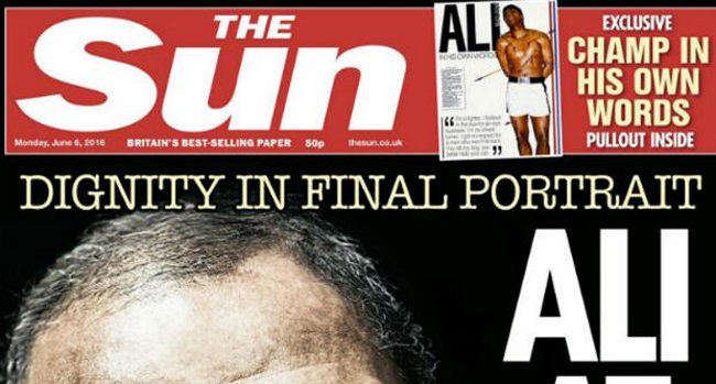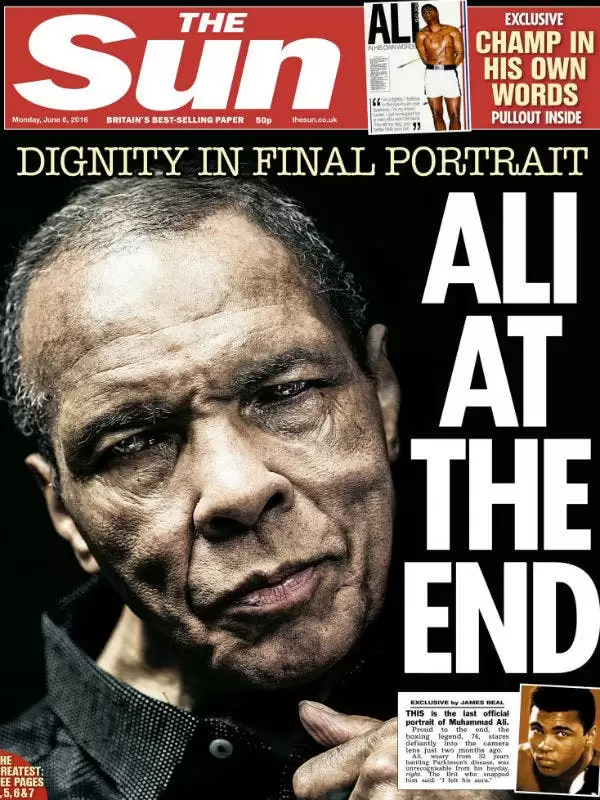 El diario británico The Sun fue noticia mundial por su foto de tapa elegida para la edición del lunes 6 de junio. Se trata de la última tomada a Muhammad Ali, hace dos meses, cuando el astro del boxeo mundial se encontraba ya muy demacrado por la enfermedad de Parkinson que sufría desde décadas atrás.