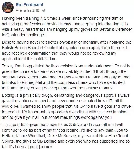 "Me he entrenado cuatro y cinco días por semana desde que anuncié mi intención de subir al ring y con toda la pena de mi corazón debo colgar los guantes", comentó Ferdinand en su página oficial de Facebook.