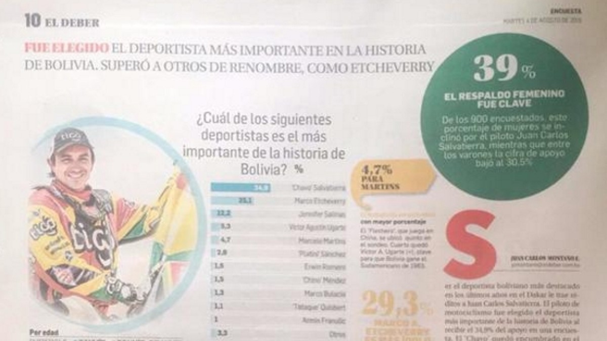La encuesta se realizó en los días previos al 6 de agosto, cuando se recuerda la fundación de Bolivia. Ante la pregunta de ¿quién es el deportista más importante de la historia del país?, los resultados fueron contundentes.