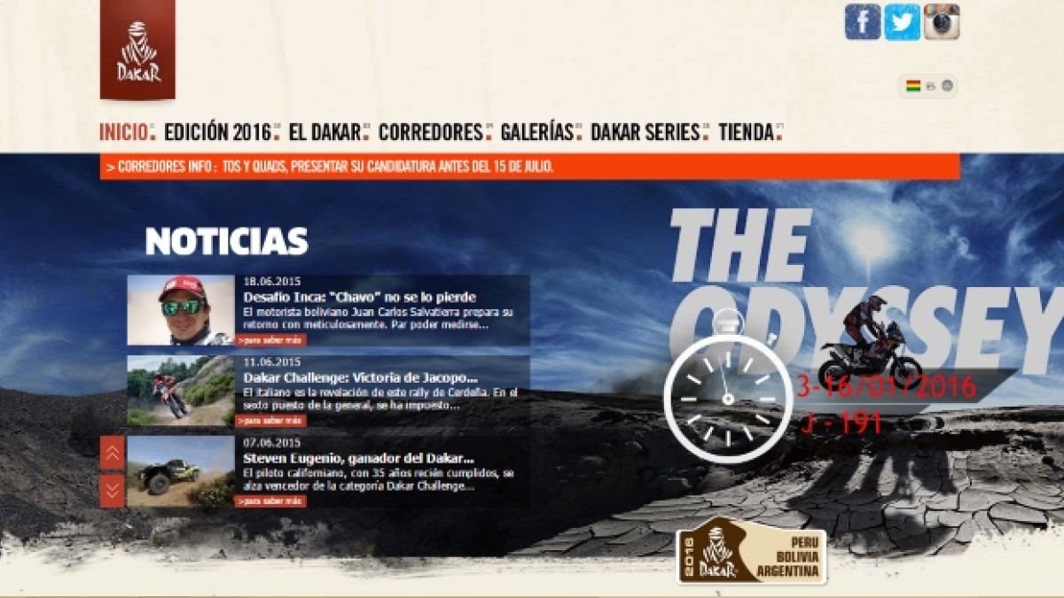 Faltan 191 días para que el Rally Dakar 2016 se ponga en marcha y Juan Carlos Salvatierra ya es noticia. El piloto boliviano de motociclismo aparece desde hace un par de días en la portada de la página web del rally más importante del mundo.