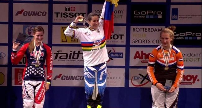 Una vez más, la colombiana Mariana Pajón se impuso en el Campeonato Mundial de BMX y sumó una nueva medalla a su vitrina. La antioqueña de 22 años rompió el récord de pista en Rotterdam y se subió a lo más alto del podio con un tiempo de 26.983 segundos. Además, el sábado en la prueba por tiempos, Pajón había ganado la medalla de bronce.