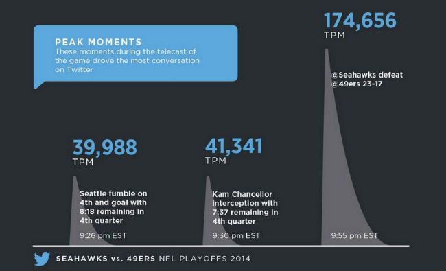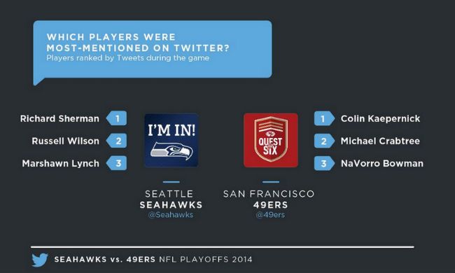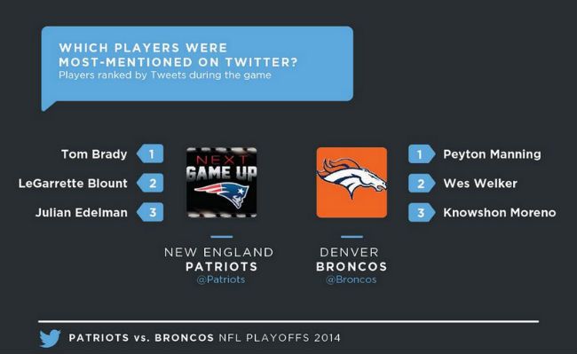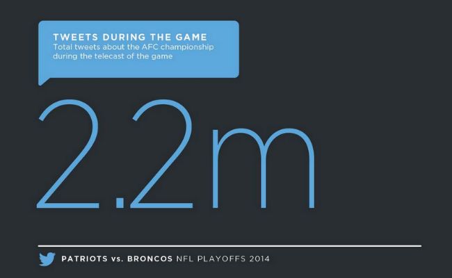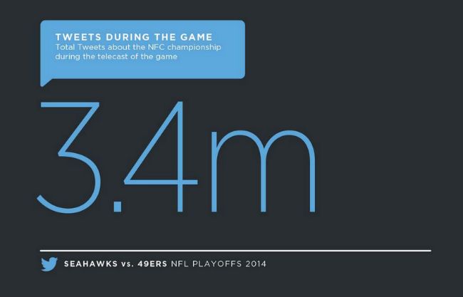 Desde Twitter se encargaron de realizar las estadísticas de los partidos en esta red social, y según reflejan los números: fueron 2,2 millones de tuits durante el partido Broncos-Patriots, y 3,8 millones en el de 49ers y Seahawks.