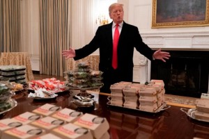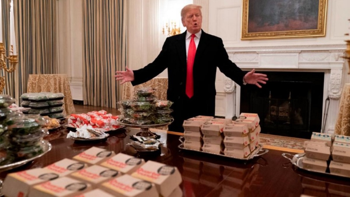 Trump recibió a los Clemson Tigers, de la Liga Universitaria de Fútbol Americano que se consagró campeón del campeonato nacional. El presidente se encargó de comprar hamburguesas de las casas de comida rápidas más conocidas, entre ellas, McDonald’s. “Pedimos comida rápida estadounidense, pagada por mí. Muchas hamburguesas, muchas pizzas”, dijo Trump.