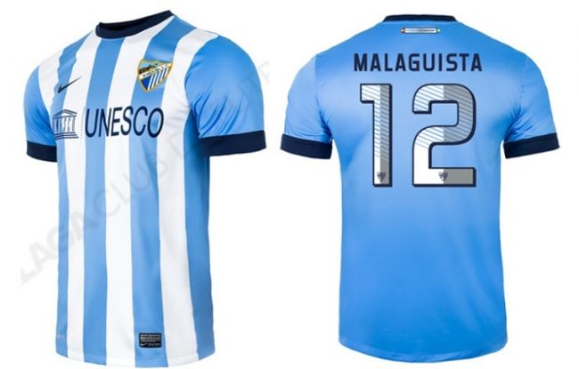 La primera indumentaria del Málaga ocupa el tercer lugar del ranking. Se trata de un tradicional modelo a franjas celestes y blancas verticales, con cuello en un tono de azul oscuro, diseñado por Nike.