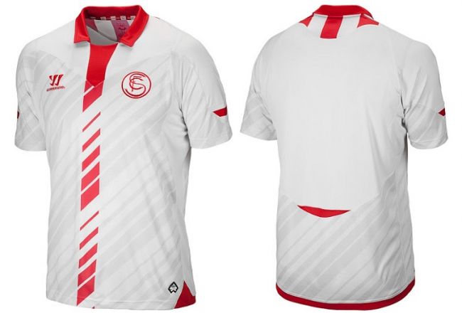 Luego, un sorprendente modelo creado por la empresa Warrior, la misma que viste al Liverpool inglés, para el Sevilla. Con cuello símil chomba color rojo y una franja entrecortada del mismo color atravesando en vertical el centro de la camiseta blanca, fue una de las más aclamadas de la presente temporada. El hecho de no contar con publicidad y tener una versión especial del escudo del club hace que se luzca y se aprecie mejor el diseño.