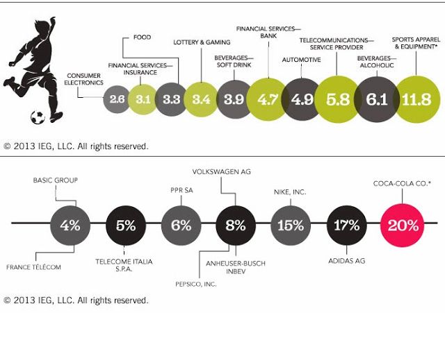 La consultora especializada IEG realizó un estudio para averiguar que rubros son los más activos en el mundo de la sponsorización y patrocinios en el fútbol, y a su vez, dentro de esos rubros que marcas son líderes.