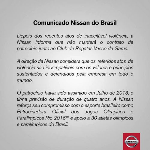 "Tras los recientes actos de inaceptable violencia que han tenido lugar, Nissan informa que no mantendrá el actual contrato de patrocinio con el Club de Regatas Vasco da Gama", explican en un comunicado oficial.