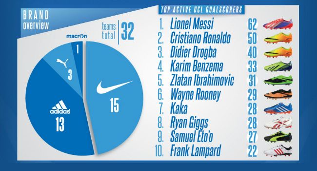 El sitio SoccerConfidential.com preparó una excelente infografía donde se ve a la perfección la presencia de cada una de las marcas en este torneo. Clubes, botines, títulos, todos los detalles de la otra Champions.