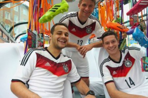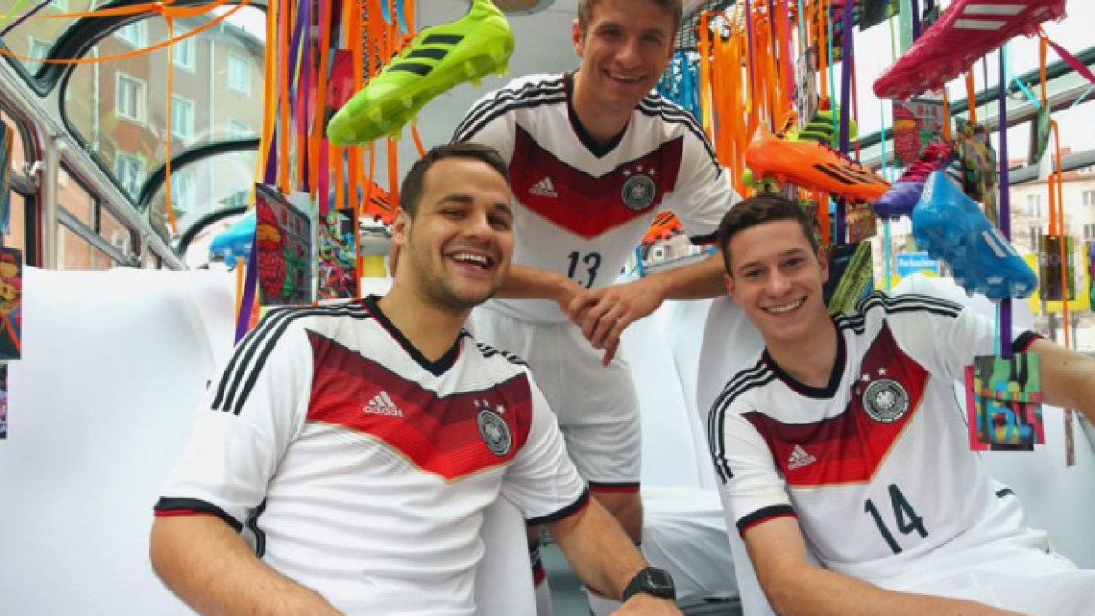 En esta oportunidad, podemos ver la nueva camiseta adidas de Alemania, que fue presentada en su país de una manera particular. Los futbolistas Thomas Müller y Julian Drexler se subieron en Munich a un micro ambientado para la ocasión y además de presentar la nueva indumentaria, se dieron el gusto de regalarle producto a la gente que se acercó.