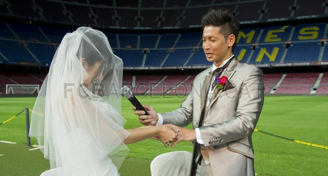 Ya hace unos años que el Camp Nou, además de partidos de fútbol, también acoge otros eventos, como casamientos. Y precisamente este jueves por la noche, a menos de 48 horas para el Clásico que los catalanes le ganarían 2-1 al Real Madrid, se celebró uno. Kenya Kishimoto y Nozomi, una pareja japonesa apasionada del fútbol y del Barça, decidieron dar el sí en el estadio donde brilla Lionel Messi. La boda civil congregó a un reducido número de invitados sobre el césped del estadio del Barça.