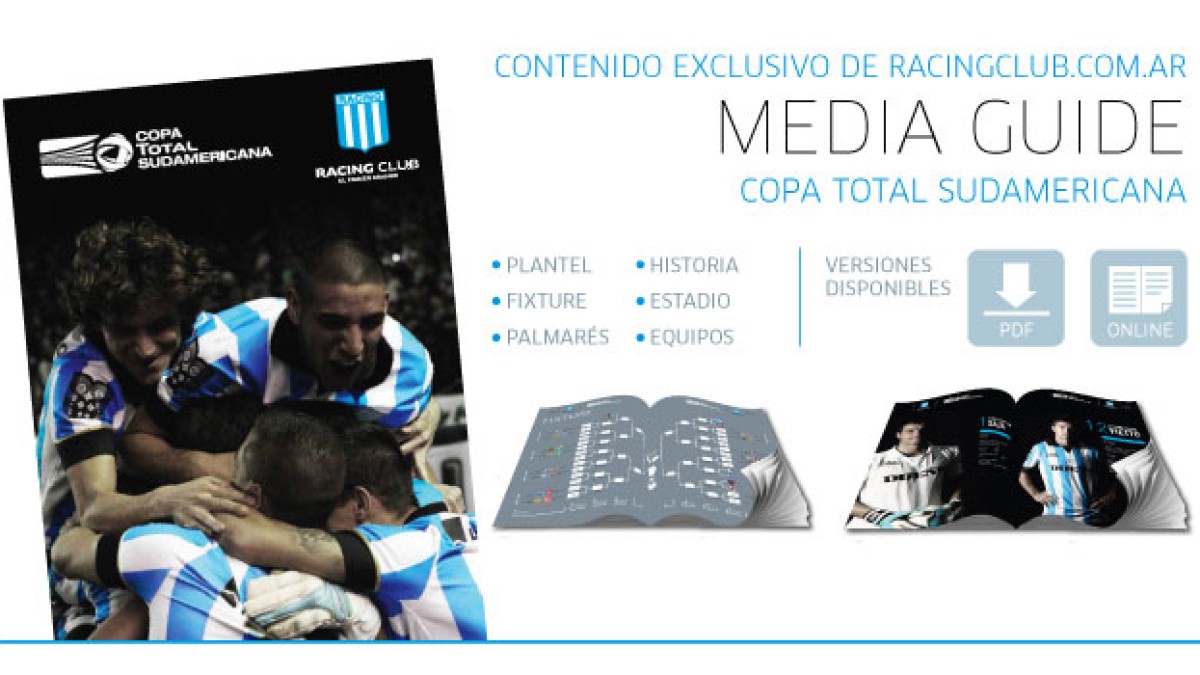 De cara al inicio de la Copa Total Sudamericana 2013, Racing Club lanza una exclusiva guía de medios con información detallada sobre los equipos participantes, fixture, plantel profesional, historia, estadio y palmarés.