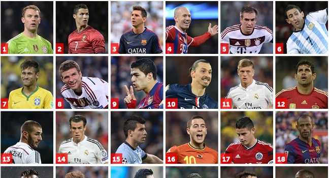 Robben, Lahm, Di María, Neymar, Müller, Suárez e Ibrahimovic completan el top 10.