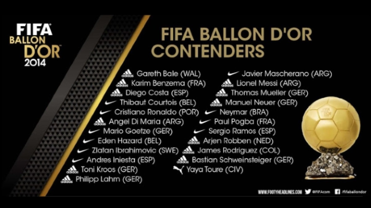 Por su parte, Nike cuenta con Thibaut Courtois, Cristiano Ronaldo, Mario Goetze, Eden Hazard, Zlatan Ibrahimovic, Andrés Iniesta, Javier Mascherano, Neymar, Paul Pogba y Sergio Ramos. Por último, el marfileño Yaya Touré es el único embajador Puma.Gareth Bale, Karim Benzema, Diego Costa, Ángel Di María, Toni Kroos, Philipp Lahm, Lionel Messi, Thomas Müller, Arjen Robben, James Rodríguez y Bastian Schweinsteiger son los futbolistas de adidas en la lista que tendrá a su ganador el próximo 12 de enero en Zurich.
