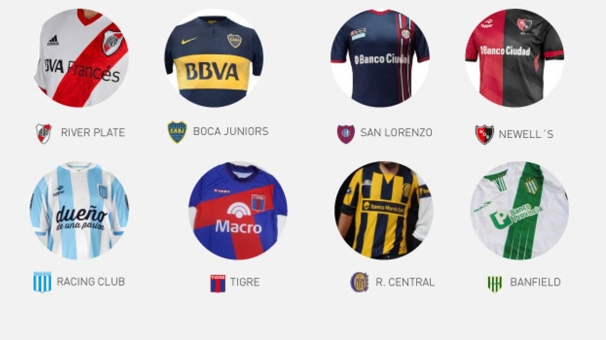 En la Primera División de Argentina, ocho equipos tienen a un banco, público o privado, como patrocinador. Ellos son: Boca y River con el BBVA Francés, San Lorenzo y Newell’s al Banco Ciudad, Racing al Banco Hipotecario, Tigre al Banco Macro, Rosario Central al Banco Municipal y Banfield al Banco Provincia. La lista se extiende a nueve si se tiene en cuenta a Independiente y su flamante vínculo con el Banco Ciudad, aunque con presencia en la espalda de la camiseta Roja.