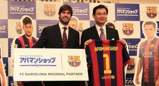 Desde el 1° de noviembre, Barcelona tendrá como regional partner a Apamanshop, una cadena de agencias de inmobiliarias de capitales japoneses. El acuerdo, que será en principio hasta 2016, continúa fortaleciendo esta categoría de patrocinadores impulsada por el club catalán con el claro objetivo de hacerse fuerte en las regiones en donde tiene más hinchas.