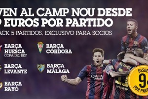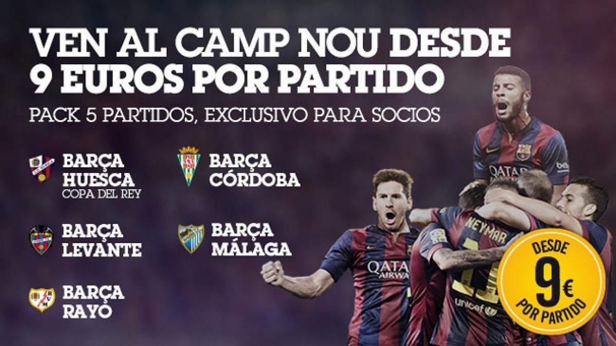 En una promoción exclusiva para socios, el Barcelona puso a la venta un pack de entradas para cuatro compromisos por la Liga BBVA y uno por la Copa del Rey con valores desde los 9 euros por partido. Este gran descuento representa una disminución del 59% en el valor original de las entradas.
