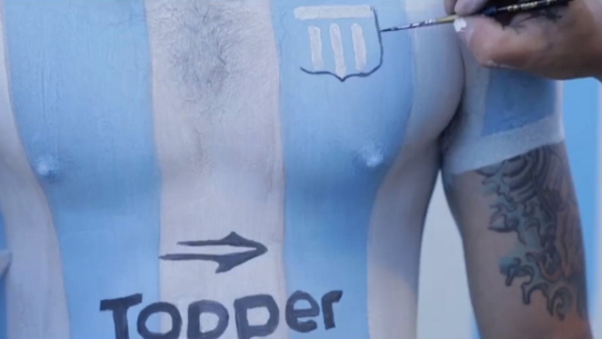 Topper, sponsor oficial de la piel del hincha de Racing es la frase que resume un video en donde niños, jóvenes y adultos, hombres y mujeres hinchas de Racing se pintaron la piel de blanco y celeste para alentar al nuevo campeón del fútbol argentino.