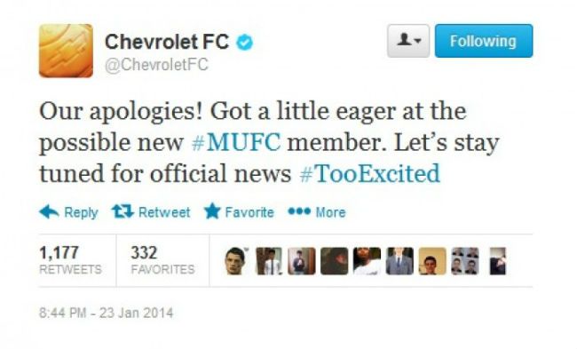 ¿Pero qué pasó? El jueves vimos en el timline de Chevrolet, patrocinador del United, como le daban la bienvenida al jugador español. Sí, antes de que se haga oficial, la compañía automotriz se lanzaba con esto. En el mismo día, y en el mismo timline aparecieron las disculpas pertinentes.