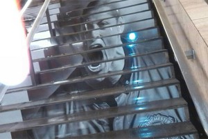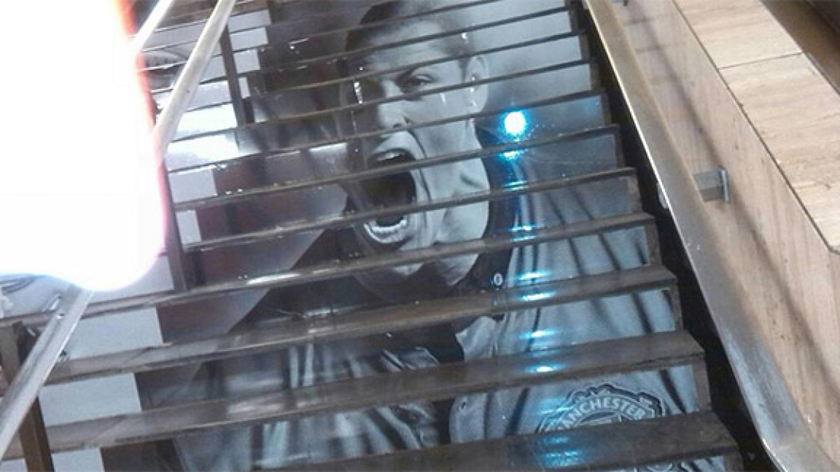 Una particular campaña de Nike en México. La cara de Javier Chicharito Hernández aparece en todas las escaleras del subterráneo en la Estación Hidalgo del Distrito Federal. El delantero, en la foto, está gritando un gol con la camiseta del Manchester United.