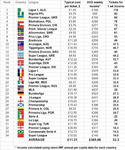 El estudio “World Football Ticket Price” llevado a cabo por el diario británico Daily Mail, se propuso exponer cuántas entradas para un partido de fútbol se podían comprar en distintos países del mundo con una semana de salario. El ranking se elaboró con datos provistos por el FMI en base al Salario Anual per cápita.