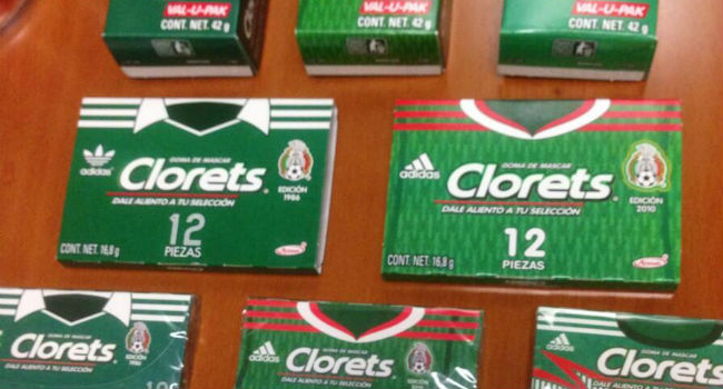 Desde México, podemos ver cómo la marca de pastillas refrescantes, Clorets, lanzó ediciones especiales de sus productos, rememorando las camisetas del Tri en los años 1986, 2010 y 2014, todas diseño de adidas.