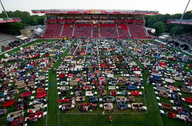 El Union Berlin de la segunda división alemana de fútbol decidió aprovechar el Mundial de Brasil 2014 para agasajar a sus fanáticos en su propio estadio. ¿Cómo? Transformó a su estadio en un living gigante, repleto de sillones, instaló una pantalla HD de 700’’. Además, el Alte Foersterei stadium fue acondicionado con iluminación e imágenes de fondo que simulan un verdadero living hogareño.