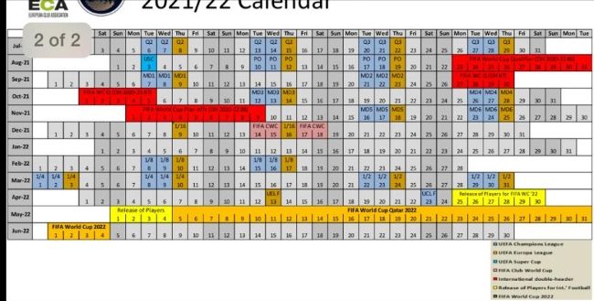 La Asociación de Clubes Europeos (ECA) junto con la Asociación de Ligas Profesionales Europeas (EPFL) elaboró una propuesta concreta que será enviada a la FIFA con sugerencias sobre la Copa del Mundo de Qatar 2022. Con la polémica por las altas temperaturas del verano qatarí y los problemas por la fecha de disputa, ambas asociaciones sugieren que la máxima competencia del fútbol mundial se dispute entre el jueves 5 de mayo y el sábado 4 de junio.