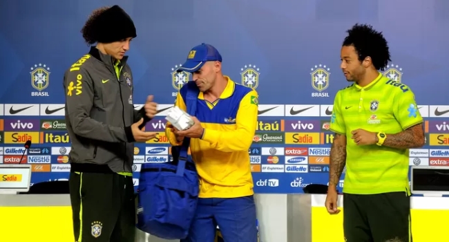Durante la conferencia de prensa de Marcelo y David Luiz, dos carteros del Correio do Brasil irrumpieron en la Granja Comary de Teresópolis y les entregaron a los jugadores 6 mil cartas con mensajes de sus fanáticos para esta Copa del Mundo.