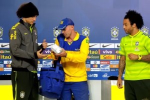 Durante la conferencia de prensa de Marcelo y David Luiz, dos carteros del Correio do Brasil irrumpieron en la Granja Comary de Teresópolis y les entregaron a los jugadores 6 mil cartas con mensajes de sus fanáticos para esta Copa del Mundo.
