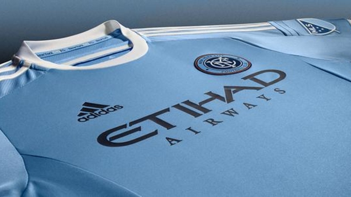 Con Etihad el pecho, la camiseta del club perteneciente al City Football Group es celeste, con las tres tiras sobre los hombros de color blanco.