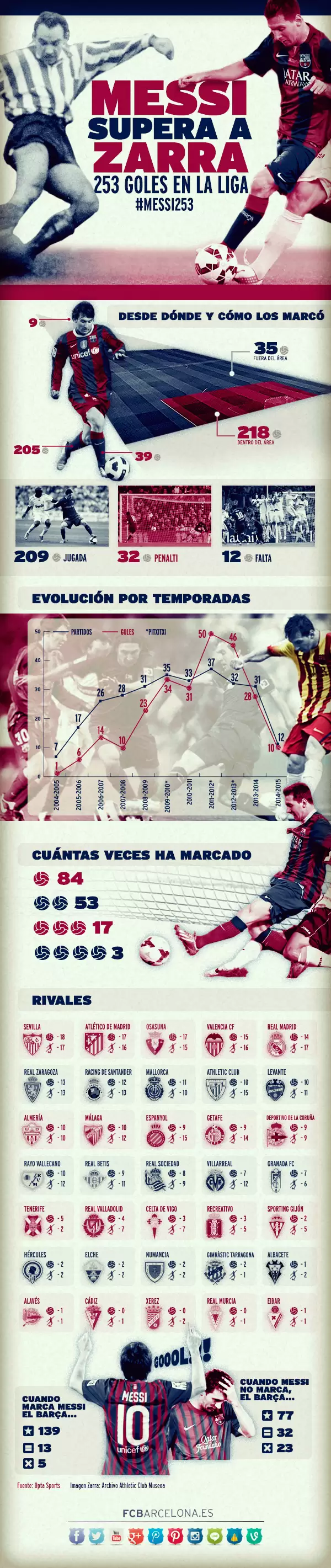 Tras superar a Telmo Zarra cómo máximo anotador en la historia de la Liga española, el Barcelona le realizó distintos homenajes a Lionel Messi. Entre ellos, en su web oficial publicó una espectacular infografía donde se detallan todos los goles del crack rosarino y diferentes estadísticas que resumen sus 253 gritos.