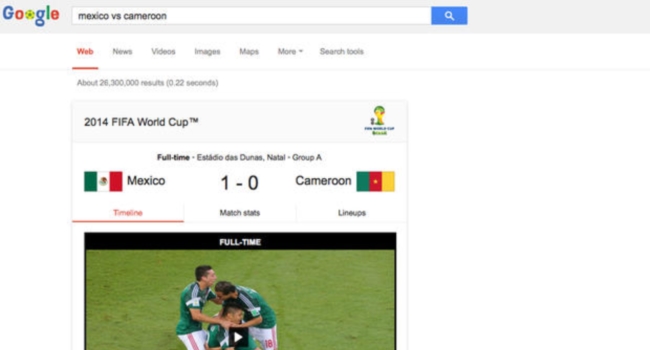 Además, ante cada búsqueda referida a un encuentro de Brasil 2014, Google arrojará un cuadro estadístico completo con toda la información de ese partido provista por ESPN FC.