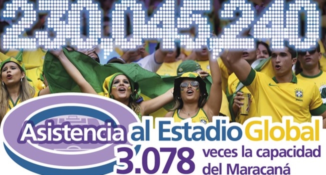 Para esta ocasión, la FIFA lanzó su #EstadioGlobal, un sitio web donde los fanáticos de todo el mundo pueden vivir al máximo lo que suceda en los 64 partidos y compartirlo en sus perfiles de las diferentes redes sociales. Según informaron, el #EstadioGlobal alcanzó los 230 millones de usuarios, algo así como 3078 Maracanás llenos en su capacidad máxima.
