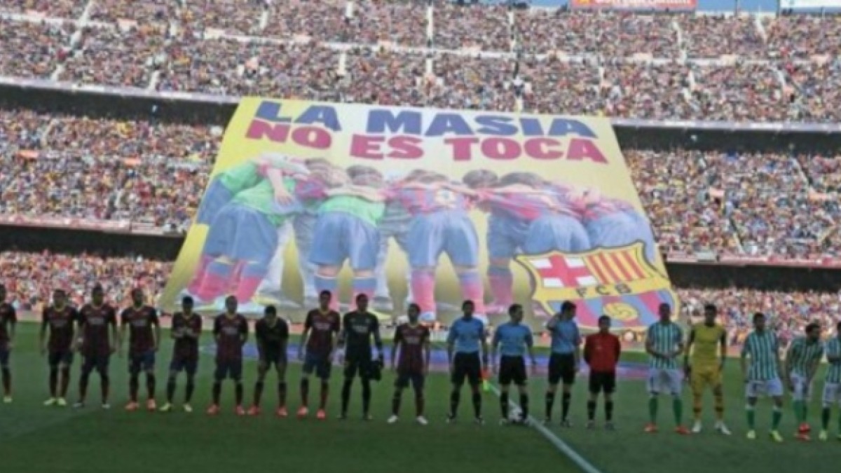 En la previa del choque ante el Betis desplegaron una bandera gigante con la inscripción: “La Masía no se toca”. De esta forma, los aficionados defienden el modelo de formación de jugadores del Barça del que surgieron, por ejemplo, grandes ídolos como Lionel Messi o Xavi Hernández.