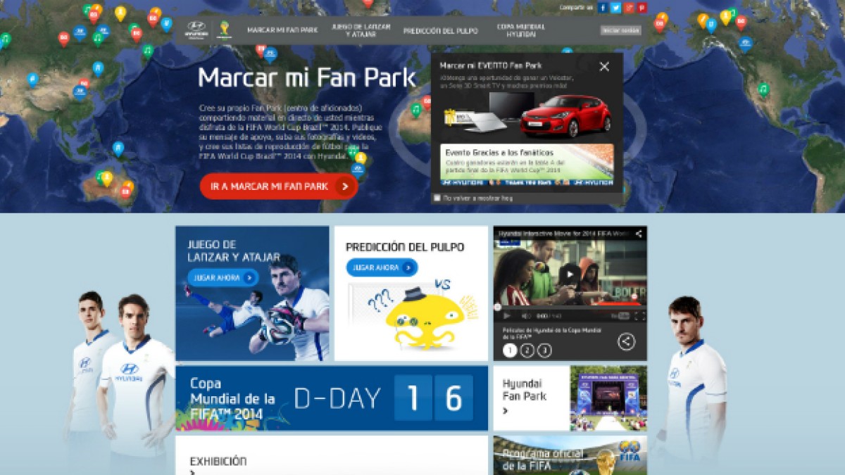 El micrositio también presenta muchos divertidos programas online, tales como el juego ‘Shoot & Save’ donde los jugadores pueden controlar a los embajadores mundiales de la marca Hyundai Motor, en una serie de desafíos para anotar (con Kaka) o atajar (con Casillas) un tiro libre o un penal. Un predictor online, llamado ‘Octopus Prediction,’ desafía a los visitantes a adivinar los resultados de los 64 partidos del torneo. En ambos juegos, los jugadores ganan puntos y pueden ganar premios, tales como guantes de arquero autografiados por Casillas y botines autografiados por Kaka y Oscar. Bajo el concepto de “Social World Cup”, Hyundai Motor se focalizó en desarrollar programas en los que grandes números de fans pueden participar activamente donde sea que estén, utilizando plataformas digitales y servicios de redes sociales. El micrositio (https://worldcup.hyundai.com), va a jugar un rol central como plataforma principal a lo largo de todo el evento.