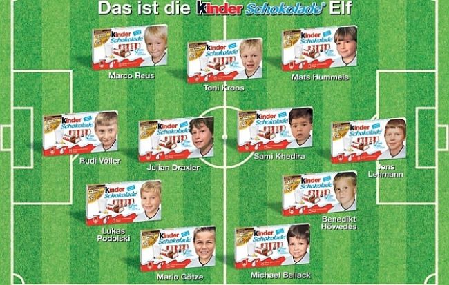 Jugadores y exjugadores de la Selección alemana de fútbol aparecen en los envases de Kinder con su imagen cuando eran niños. Así, Marco Reus, Toni Kroos, Rudi Völler, Jens Lehmann, Michael Ballack y Mario Götze, entre otros, están presentes.