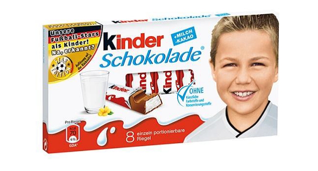 Jugadores y exjugadores de la Selección alemana de fútbol aparecen en los envases de Kinder con su imagen cuando eran niños. Así, Marco Reus, Toni Kroos, Rudi Völler, Jens Lehmann, Michael Ballack y Mario Götze, entre otros, están presentes.