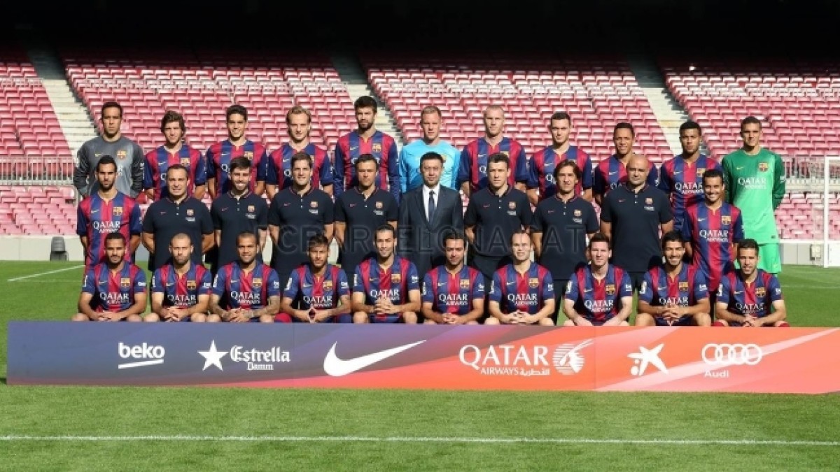 En la mañana de este miércoles, el plantel profesional y el cuerpo técnico del FC Barcelona posaron para la foto oficial de la temporada 2014/2015. La sesión tuvo dos fotos, primero con ropa formal de Replay, patrocinador del club, y luego con la indumentaria de juego provista por Nike.