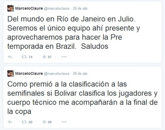 "Como premio a la clasificación a las semifinales si Bolívar clasifica, los jugadores y cuerpo técnico me acompañarán a la Copa del Mundo en Río de Janeiro. Seremos el único equipo ahí presente y aprovecharemos para hacer la pretemporada en Brasil" comunicó Claure vía Twitter.