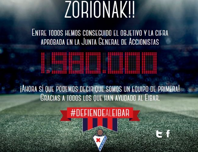 A través de la campaña #DefiendeAlEibar, el club presidido por Álex Aranzabal lleva hasta el momento recaudados 1.980 millones de euros, con lo cual el objetivo está cumplido. Para lograrlo, el club puso a la venta esa cantidad de acciones y, finalmente, cumplirá el sueño de recibir en su estadio Ipurúa de 5250 espectadores a las grandes estrellas del fútbol español.