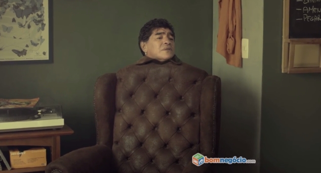 Con sólo su cabeza a la vista y con el cuerpo de sillón, Diego Maradona es la estrella de un nuevo comercial en la víspera mundialista. Se trata de la campaña de la página brasilera de ventas en internet BomNegocio.