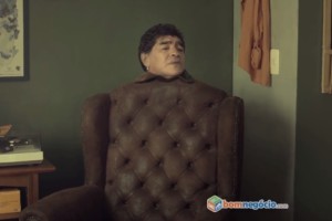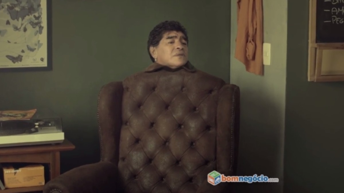 Con sólo su cabeza a la vista y con el cuerpo de sillón, Diego Maradona es la estrella de un nuevo comercial en la víspera mundialista. Se trata de la campaña de la página brasilera de ventas en internet BomNegocio.
