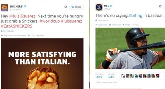 El incidente entre Luis Suárez y Giorgio Chiellini fue rápidamente lo más comentado en los últimos días de la Copa del Mundo de Brasil 2014. Las marcas no dejaron pasar este hecho y, también rápidamente, se hicieron eco de lo sucedido para promover sus productos. Así, McDonald’s, Snickers, Listerine y hasta la MLB se sumaron a través de sus perfiles en las redes sociales.