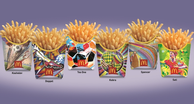 Como parte del lanzamiento de GOL! McDonald’s modifica por primera vez y a nivel global su empaque de papas medianas y pequeñas, con diseños creados por 12 artistas de diferentes lugares del mundo.