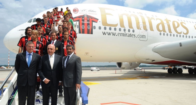 Emirates comenzó su vínculo con Milan en 2009 y además patrocina al Real Madrid y Paris Saint Germain, entre otros.