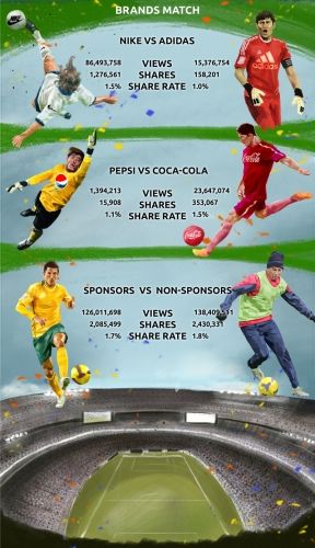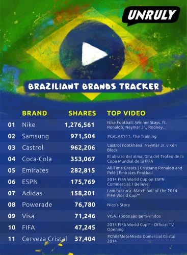 Tras un informe de la agencia de marketing y tecnología Unruly, se supo que las campañas de Nike, Samsung y Castrol en el marco de Brasil 2014 son hasta el momento las más exitosas en las redes sociales, con la mayor cantidad de likes y shares. Unruly armó el Dream Team con las once marcas con mayor repercusión y un detalle particular del informe es que el 54% de la cantidad total de reproducciones (2.4 millones) corresponden a marcas que no son patrocinadores oficiales de la competencia.