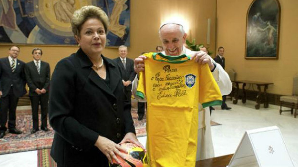 El Sumo Pontífice recibió los regalos en mandos de la Presidente de Brasil, Dilma Rousseff, y Francisco, entre risas, le dijo: "Con esos regalos voy a tener que rezar para que Brasil gane el Mundial ", a lo que Rousseff le pidió que fuera "neutral".