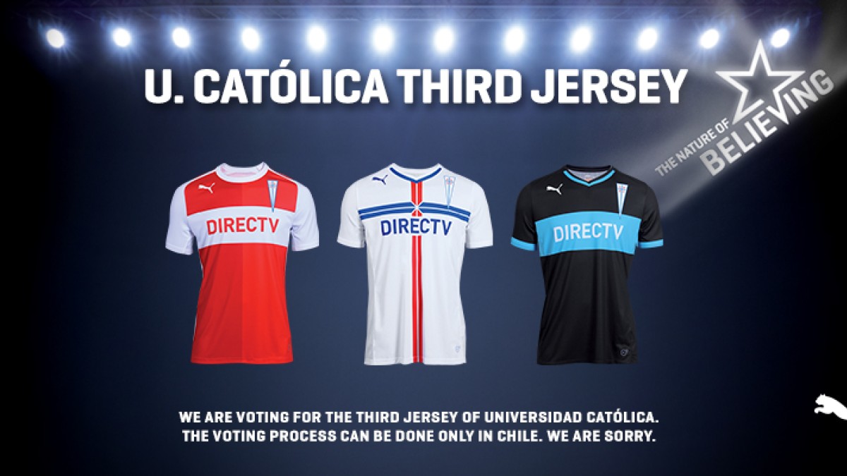 A través de una votación en su fan page oficial en Facebook, Puma les permitirá a los aficionados de la Universidad Católica decidir cuál será la nueva camiseta del club chileno. Sin embargo, sólo podrán votar aquellos que vivan en Chile, lo cual despertó algunas quejas de los fanáticos que no viven en el país.