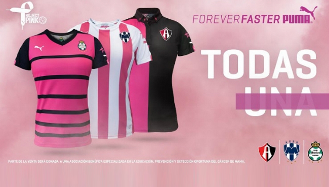 En la gran iniciativa de la Liga Mx por la lucha contra el cáncer de mamas, los clubes se sumaron a la propuesta y con ellos sus patrocinadores. Puma, sponsor técnico de Atlas, Santos Laguna y Rayados de Monterrey, presentó tres modelos de camisetas especiales para los equipos, con el rosa como color característico.